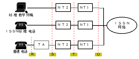 TA:終端適配器,完成非標(biāo)準(zhǔn)設(shè)備到ISDN速率的匹配及協(xié)議轉(zhuǎn)換(它可以在TE2中內(nèi)嵌實現(xiàn));以上各類設(shè)備間的連接接口稱為參考點(見下圖):