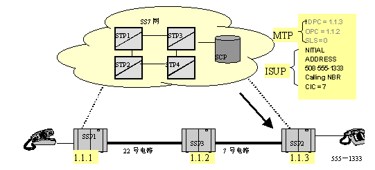 如下圖所示,當(dāng)一個(gè)用戶(hù)摘機(jī)并拔被叫號(hào)碼,交換局(SSP1)收集并分析被叫號(hào)碼,分析到被叫不是本局內(nèi)用戶(hù),而是目的信令點(diǎn)編碼為1.1.3交換局的用戶(hù),于是,SSP1在路由表中查找到達(dá)1.1.3的路由,然后用找到的鏈路把IAM消息發(fā)送出去,如圖中箭頭所示。
