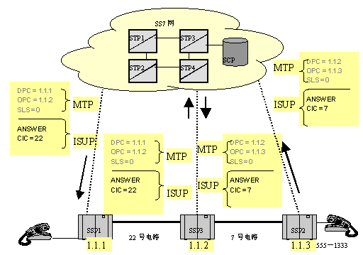 當(dāng)消息(IAM)到達(dá)路由中下一個(gè)交換點(diǎn)1.1.2時(shí),MTP層再次分析路由。在1.1.2中,MTP查找目的信令點(diǎn)編碼,并發(fā)現(xiàn):這個(gè)消息不是發(fā)給自己的,然后就找出轉(zhuǎn)發(fā)這個(gè)消息的路由及具體的鏈路。