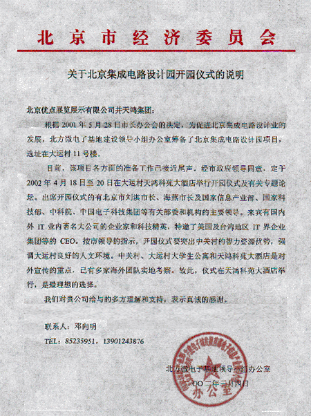 首屆呼叫中心運(yùn)營管理研討會組委會 重要通告 本次大會組委會及會議舉辦地點(diǎn)“天鴻科園大酒店”日前接到北京市人民政府通知,由于“北京集成電路設(shè)計(jì)園開園儀式”將于2002年4月18日至4月20日在大運(yùn)村、天鴻科園大酒店舉行開園儀式及相關(guān)活動,屆時將有北京市劉淇市長、海燕市長及國家信息產(chǎn)業(yè)部、國家科技部、中科院、中國電子科技集團(tuán)等有關(guān)部委和機(jī)構(gòu)的主要領(lǐng)導(dǎo)出席。按市領(lǐng)導(dǎo)指示,為配合此次重大活動圓滿舉行,“首屆呼叫中心運(yùn)營管理研討會”日期更改為2002年4月23日至4月25日在北京天鴻科園大酒店舉行,望有關(guān)參會單位做好相應(yīng)的后續(xù)工作。特此通告! 組委會對有關(guān)參會單位的支持與配合表示真誠的感謝。 首屆呼叫中心運(yùn)營管理研討會組委會