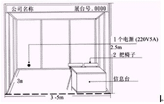 標準展臺價格包括三面墻板(邊角展臺為兩面墻板)、楣板及中英文公司名稱、5安培電源、地毯、兩只日光燈(15平方米展臺為三只日光燈)、一個信息臺、兩把椅子、一個廢紙簍。