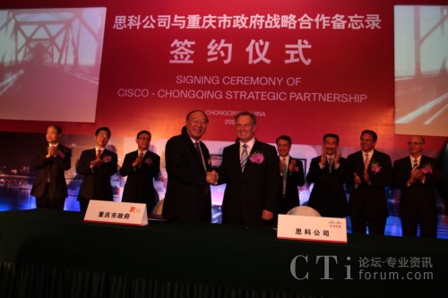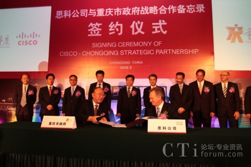 CTI論壇(ctiforum)9月14日消息:2009年9月11日,重慶市人民政府與思科正式簽訂合作備忘錄,雙方將結(jié)為戰(zhàn)略合作伙伴關(guān)系,就通信產(chǎn)品制造、“智能+互聯(lián)城市”試點示范、綠色技術(shù)研發(fā)與創(chuàng)新及風險投資等多方面展開深入合作。此次合作將進一步加快重慶市產(chǎn)業(yè)結(jié)構(gòu)和產(chǎn)品結(jié)構(gòu)調(diào)整,促進內(nèi)陸開放城市建設(shè);加快發(fā)展重慶通信產(chǎn)品產(chǎn)業(yè)集群,把重慶建設(shè)成為西部重要的現(xiàn)代通信產(chǎn)品制造基地;推動以信息產(chǎn)業(yè)為主體的重慶高新技術(shù)產(chǎn)業(yè)發(fā)展以及本土創(chuàng)新和可持續(xù)性能力的提供,更高效便捷地加快本土企業(yè)的國際化進程;整合多方國際資源,以推進重慶在中國率先成為“智能+互聯(lián)城市”,讓市民享受更多的工作和生活便利及實惠。作為思科在華創(chuàng)新及可持續(xù)發(fā)展戰(zhàn)略實施的又一里程碑,此次合作不僅是思科“智能+互聯(lián)城市”計劃在中國與當?shù)卣氖锥群献黜椖,也是思科在“協(xié)作型創(chuàng)新模式”指導(dǎo)下激勵本土創(chuàng)新的全新實踐。