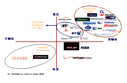 朗訊IMS融合解決方案的優(yōu)勢決定了其市場的領(lǐng)導(dǎo)地位,截至2006年24月,朗訊在全球已簽約77個IMS商用合同和77個試驗(yàn)合同。尤其是北美五大運(yùn)營商(Cingular、Sprint、at&t、BellSouth、Verizon)中有4個已經(jīng)與朗訊簽訂了IMS