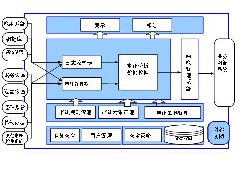 圍繞《薩班斯法案》第404條款的基本要求,結(jié)合運營商的業(yè)務(wù)支撐系統(tǒng)運維特點,面向業(yè)務(wù)系統(tǒng)的安全審計系統(tǒng)一般應(yīng)具備以下功能: