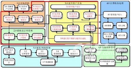 AIOpenCRM將重點支持客戶/市場層面的服務開通、服務保障的內容,具體包含了市場營銷、銷售及訂單管理、提升客戶關系、計費帳務處理、服務開通管理、服務報障管理這六個高層流程的前三個。如下圖: