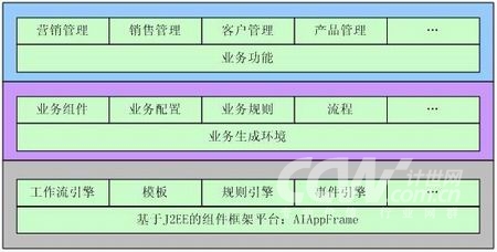 從總體上看AIOpenCRM定位為一個業(yè)務生成平臺,它分為三個部分,一個基于各種中間件(AIAppFrame、WorkFolw、BusinessRule等)實現的業(yè)務生成環(huán)境,第二個是基于業(yè)務邏輯數據模型實現的業(yè)務對象,最后是基于業(yè)務生成環(huán)境以及業(yè)務對象實現的業(yè)務功能。它們都是基于J2EE技術進行實現的。如下圖所示: