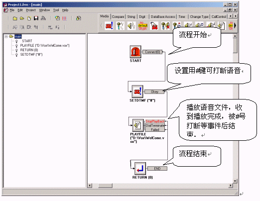 速能呼叫中心中間件的IVR流程開發(fā)接口簡單易學(xué),編寫人員并不需要了解底層的實(shí)現(xiàn)原理、Dialogic硬件等知識,而將精力完全放在業(yè)務(wù)開發(fā)上即可。