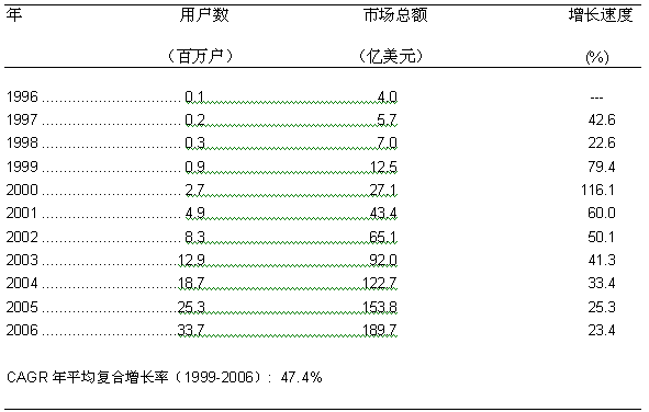 圖一: 美國寬帶接入服務市場的增長歷史和預測 1996-2006