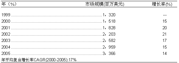 如圖一所示,1999年,美國的固定網(wǎng)OSS服務(wù)保障的市場規(guī)模約為13.2億美元。而在2000年,這一市場比上一年增長了15%,達(dá)到15.18億美元。根據(jù)Frost & Sullivan的預(yù)測,從2000年到2005年間,美國的固定網(wǎng)OSS服務(wù)保障市場的年平均復(fù)合增長率將高達(dá)17%,市場規(guī)模在2005年預(yù)計會增長至33.66億美元。