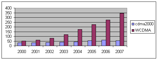 2000年,3G市場(chǎng)收入在cdma2000(大約31億美元,占38%)與WCDMA(大約50億美元,占62%)分布為1/3比2/3。我們不難看出,這種變化有利于WCDMA。到2007年,預(yù)計(jì)WCDMA將占全部市場(chǎng)收入的86%。這是由于對(duì)于WCDMA,運(yùn)營商需要增加支出來將其網(wǎng)絡(luò)升級(jí)為GPRS、EDGE與WCDMA。同時(shí),在預(yù)測(cè)期內(nèi),TDMA運(yùn)營商最終要將其所有現(xiàn)存的TDMA與模擬特性升級(jí)為GSM/GPRS。相比之下,CDMA運(yùn)營商處于良好的狀態(tài),其現(xiàn)有基礎(chǔ)設(shè)施的大部分軟件已經(jīng)升級(jí)。CDMA運(yùn)營商,如Verizon,確實(shí)也有模擬特性,但是較之GSM/TDMA而言,它們要低得多。CDMA運(yùn)營商支出的大部分將以新的Cell sites的形式出現(xiàn)的覆蓋率。