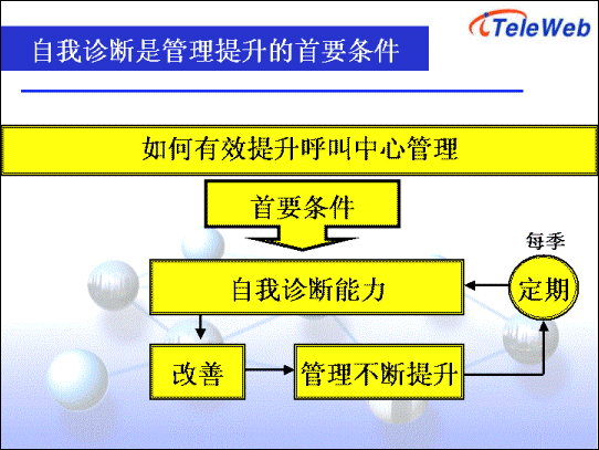 在如何提升呼叫中心運營管理中,自我診斷是首要步驟。通過對現(xiàn)有管理流程的診斷,找出需要改進的項目以及空間,從而評估與呼叫中心整體營運目標是否相符。同時透過與整體組織架構(gòu),同業(yè)比較以及標準基準,即可找出需要改進的地方。