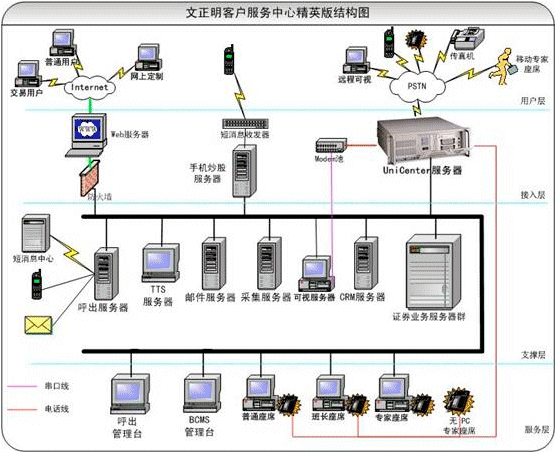 泰陽證券有客戶2萬多,相當(dāng)一部分要通過電話委托程序作交易。原有電話委托系統(tǒng)是模擬線。交易忙時,很多股民打不進去。以前的業(yè)務(wù)相對也比較簡單。文正明公司在了解了泰陽方面的業(yè)務(wù)需要后,用公司的UniCenter系統(tǒng)和深圳東進公司的ISDN數(shù)字卡、傳真卡和座席卡,為泰陽搭建了一個新的語音應(yīng)用平臺。