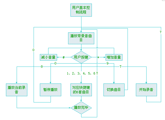 用戶設(shè)定:用戶可以通過(guò)語(yǔ)音自動(dòng)導(dǎo)航或者通過(guò)上網(wǎng)來(lái)自主選擇并設(shè)定背景音效,并把其中最常用的六種音效對(duì)應(yīng)1~6號(hào)按鍵,這樣用戶在自己使用的過(guò)程中就可以根據(jù)當(dāng)時(shí)的情況使用自己喜歡的背景音效了。