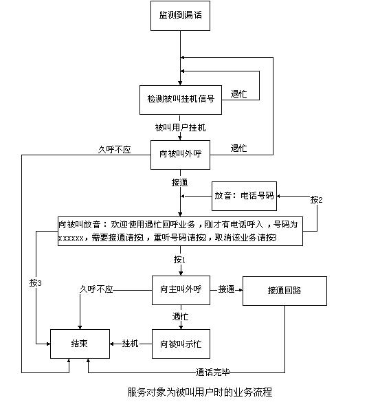 當(dāng)服務(wù)對(duì)象是被叫用戶時(shí),產(chǎn)生遇忙漏話后,東進(jìn)漏話監(jiān)測(cè)設(shè)備(DMCS)實(shí)時(shí)檢測(cè)被叫用戶的掛機(jī)信號(hào),如果被叫掛機(jī),則先向被叫外呼,呼出接通后,語音提示“歡迎使用遇忙回呼業(yè)務(wù),剛才有電話呼入,號(hào)碼為xxxxxx,需要接通請(qǐng)按1,重聽號(hào)碼請(qǐng)按2,取消該業(yè)務(wù)請(qǐng)按3”,如按1,系統(tǒng)向原主叫外呼(亦稱回呼),回呼成功(ACM)后,建立話音回路,進(jìn)一步接續(xù);如回呼原主叫時(shí)遇忙(SLB、STB等),則回呼失敗,向被叫用戶示忙。