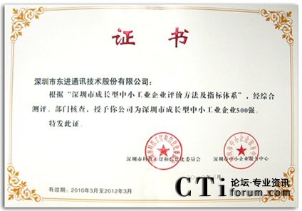 CTI論壇(ctiforum)4月6日消息(記者 潘婷婷):由深圳市政府大力支持,深圳市科工貿(mào)信委、深圳市中小企業(yè)服務(wù)中心,深圳市統(tǒng)計(jì)局,深圳大學(xué)管理學(xué)院聯(lián)合組織評測的“深圳市成長型中小工業(yè)企業(yè)500強(qiáng)”,于3月31日被正式認(rèn)定,深圳市東進(jìn)通訊技術(shù)股份有限公司榮列其中。今后,作為深圳市中小企業(yè)成長工程的重點(diǎn)培育對象,東進(jìn)技術(shù)將獲得政府公共資源的傾斜扶持,促進(jìn)加快發(fā)展,形成“示范效應(yīng)”。