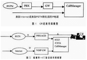這個(gè)問題對已有傳統(tǒng)呼叫中心的企業(yè)單位擴(kuò)容和增加新功能非常重要。由上面討論可知,D2A的接入辦法完全保留了原有ACD的投資,可以簡單地實(shí)現(xiàn)平滑升級,而A2D又是怎么解決這個(gè)問題的呢?比較有代表性的解決方案有兩種,一種是效仿圖1的做法,在ACD的用戶側(cè)加入VoIP網(wǎng)關(guān),再統(tǒng)一接入(如圖4所示);另一種方法是采用價(jià)格比較便宜的IP座席卡,并在Call Manager中加入CTI的有關(guān)協(xié)議模塊(如圖5所示)。