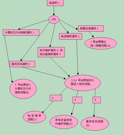 在交互式語(yǔ)音應(yīng)答系統(tǒng)IVR的幫助下,各服務(wù)流程有條不紊地進(jìn)行,每個(gè)職能部門(mén)管理自己部門(mén)的流程,提供全方位的客戶所要求的服務(wù)。下面我們以銷售咨詢?yōu)槔,看看這個(gè)簡(jiǎn)單的工作流程。