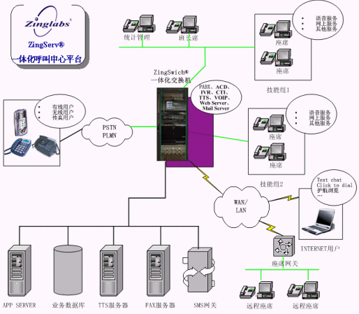 ZingServ®平臺(tái)的WEB呼叫/Chat 功能主要面向Internet用戶,用戶可通過(guò)Modem撥號(hào)、DDN專線、ISDN撥號(hào)、局域網(wǎng)、ADSL、Cable