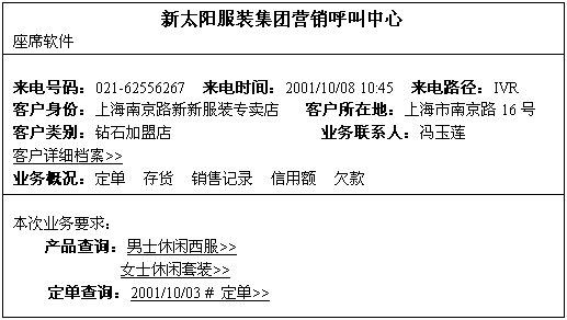 下圖是一個(gè)系統(tǒng)識(shí)別客戶身份和業(yè)務(wù)要求后在座席電腦上彈出信息處理窗口的例子: