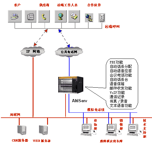 奧迪堅呼叫中心平臺在一臺服務器(AltiServ)上整合了所有常用呼叫中心的功能,并提供與CRM軟件的接口平臺,從而真正提升客戶滿意度,提高企業(yè)本身的盈利能力。