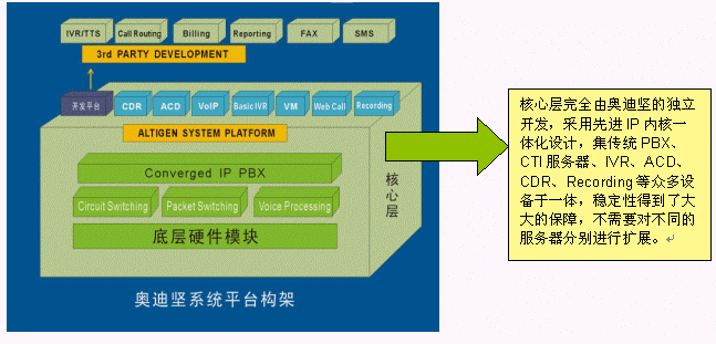 交換功能作為整個(gè)系統(tǒng)的核心功能,是系統(tǒng)一切功能的基礎(chǔ)。奧迪堅(jiān)高度一體化通訊服務(wù)器AltiServ,采用先進(jìn)的DSP等技術(shù),將傳統(tǒng)的語(yǔ)音交換和IP包交換在系統(tǒng)底層實(shí)現(xiàn),使系統(tǒng)的技術(shù)水平、功能及穩(wěn)定性達(dá)到了一個(gè)新的高度,可以實(shí)現(xiàn)大容量電話的呼入/呼出處理、電話轉(zhuǎn)接、支持PRI、E1、中國(guó)一號(hào)信令、七號(hào)信令、模擬線路等多種接入方式,同時(shí)還具備傳統(tǒng)PBX所不具備的強(qiáng)大的語(yǔ)音信箱、電話會(huì)議功能、VoIP、界面友好的系統(tǒng)管理功能等。由于在底層對(duì)VoIP支持,所以既可以使用普通電話機(jī),也可以使用IP話機(jī)或者軟電話登陸到系統(tǒng),豐富了用戶的選擇的范圍,方便了用戶使用并節(jié)省投資,并且VoIP技術(shù)擴(kuò)展了增值空間,可以用IP座席輕松構(gòu)建遠(yuǎn)程專家座席,更加適合互聯(lián)網(wǎng)時(shí)代的應(yīng)用。