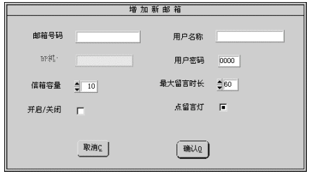 2). 除信箱號碼為必須輸入外,其它各項若不輸入,系統(tǒng)會按缺省值設(shè)置信箱參數(shù)。 3). 設(shè)置完成后按確認按鈕即增加一個信箱號碼。若不想增加,按取消按鈕退出。
