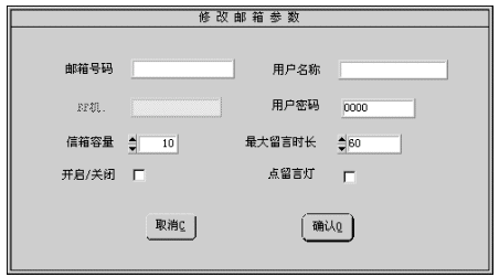 1). 您可修改的參數(shù)有:用戶名稱、用戶密碼、信箱容量、最大留時長、開啟/關(guān)閉、點留言燈。有關(guān)參數(shù)的細節(jié)將在增加信箱一節(jié)中介紹。