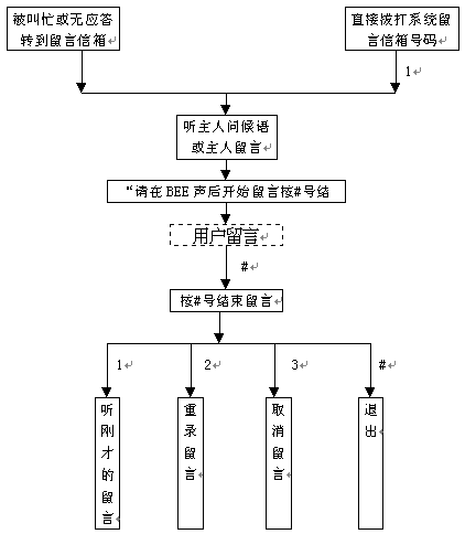 3). 若輸入的分機信箱號碼正確,此時系統(tǒng)會提示用戶"留言請按1,主人訪問請按2",按1后即可給該信箱留言。