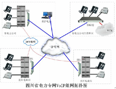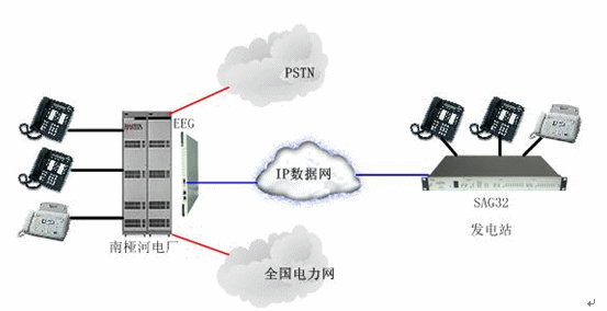 說明:南椏河電廠在現(xiàn)有的IP網(wǎng)絡(luò)基礎(chǔ)上,利用IP中繼網(wǎng)關(guān)EEG與SAG32電信級模擬VoIP網(wǎng)關(guān)實現(xiàn)交換機的遠(yuǎn)程放號,實現(xiàn)了發(fā)電站與電廠、省電力網(wǎng)、電信等的組網(wǎng),解決了實際的通信問題。在方案中,具有組網(wǎng)簡單,維護方便,通話質(zhì)量高等特點,得到當(dāng)?shù)赜脩舻恼J(rèn)可。
