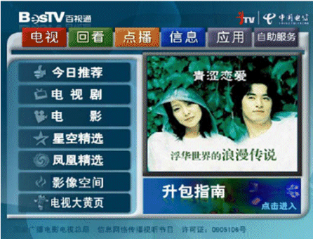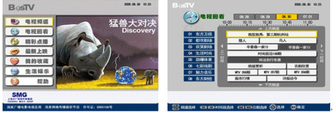 上海IPTV業(yè)務(wù)自2006年9月1日放號(hào)以來,發(fā)展十分迅速。截止10月7日,上海電信IPTV業(yè)務(wù)共計(jì)發(fā)展用戶達(dá)2.2萬(wàn)。如下是上海IPTV商用系統(tǒng)EPG頁(yè)面: