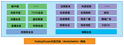 奔流(RollingStream)系統(tǒng)不僅僅支持以LiveTV、Timeshift-TV、VOD、TVOD等為基礎(chǔ)的各項(xiàng)功能,而且具有良好的功能上的可擴(kuò)展性,在此平臺(tái)上可以支持眾多豐富多彩的增值互動(dòng)業(yè)務(wù);诒剂(RollingStream)具有無限的業(yè)務(wù)增長(zhǎng)空間,如下圖所示意: