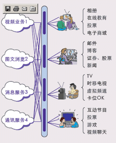 - 豐富多彩的互動(dòng)增值業(yè)務(wù): 可視電話、電視短信、電視競(jìng)猜、電視投票、游戲、信息瀏覽等