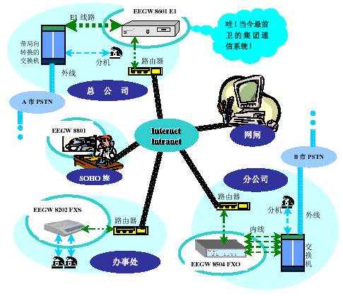 - 在IP網內建立智能交換中心完成兩個異質網PSTN網和數(shù)據(jù)網在本地異地的集成