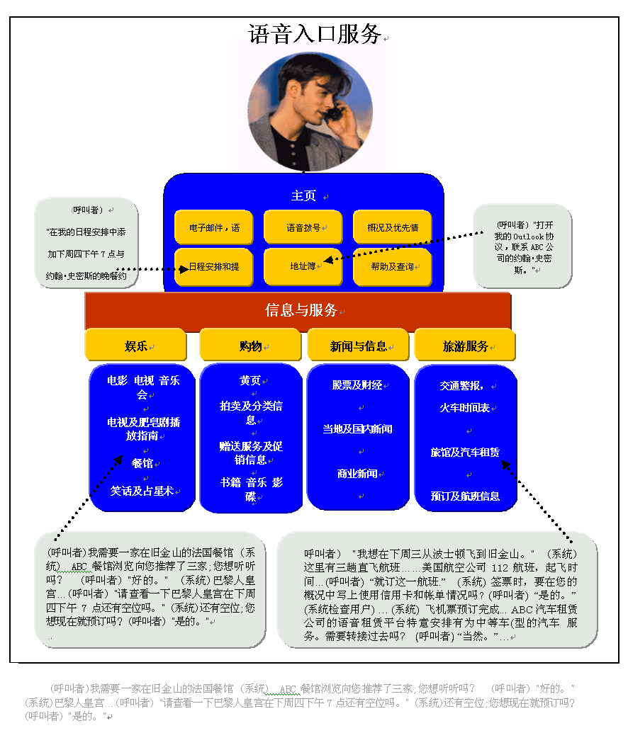 語音網(wǎng)最吸引人之處就在于它可以在一次通話中,同時處理多個任務(wù)。下圖表明一名商務(wù)人員是如何安排好與一個未來的商務(wù)旅行有關(guān)的一系列任務(wù)的。他獲取了對自己有用的信息,順利達成了一項語音商務(wù)交易,接收個人信息和辦公室的幫助,并撥打電話所有這些都是在一個同步過程中完成的。