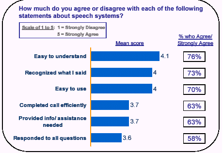 此外,十個人中九個人認(rèn)為他們從使用語音服務(wù)中得到了在鍵盤式服務(wù)中得不到的價值不菲的好處,并有70%的人說如果語音服務(wù)系統(tǒng)取代了按鍵式系統(tǒng)的話,他們的效率也將得以提高。