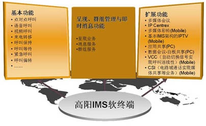 高陽IMS軟終端產品線是基于IMS(IP多媒體子系統(tǒng))技術,以通信終端功能為主,融入IT特性,將在線狀態(tài)、即時消息和群組管理融為一體,集合語音、數(shù)據、視頻通信,提供統(tǒng)一的用戶體驗,實現(xiàn)移動電話、PC之間的互聯(lián)互通,并且符合3GPP/ETSI/OMA/IETF/ITU-T等國際標準組織和中國電信/中國移動規(guī)定的IMS相關規(guī)范。