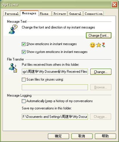 Messenger 6.0必須在個人選項中進行設(shè)置后才可以自動保存聊天記錄,默認是不支持的。