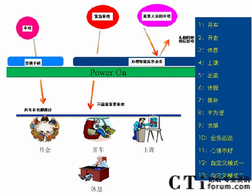 智能應答業(yè)務是針對消費者不便通話時的一個增值業(yè)務。當被叫用戶有來電時,因為自己的原因不便通話而掛斷電話后通過手機彈出的菜單,供用戶選擇與對方進行的后續(xù)溝通。被叫用戶可以根據(jù)所處的情況選擇對應的情景,系統(tǒng)將根據(jù)用戶選擇的情景對應給主叫用戶發(fā)送短信和放音。智能應答業(yè)務給了我們禮貌拒接的機會。當您正在會議室里和客戶如火如荼的策劃下個項目,當然不想被其他人打擾。突然有個電話打了進來,接還是不接,不接有可能是一個潛在的客戶,接了又是對目前工作的一種打斷。如果你辦理了智能應答業(yè)務,當你掛斷電話的同時手機上將出現(xiàn)一個菜單,你可以根據(jù)當前具體情況選擇目前所處的情景(開車、開會、上課……等)。如你選擇了某種情景,系統(tǒng)將根據(jù)用戶選擇的情景,給主叫用戶播放相應的語音通知(如:“您撥叫的用戶正在開會,請稍后再撥”)。
