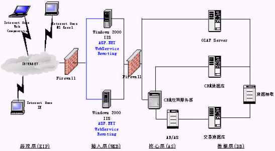 展現(xiàn)層實(shí)現(xiàn)定制化的、支持各種接入設(shè)備的統(tǒng)一消息平臺(tái)是非常必要的,它必將極大地促進(jìn)公司服務(wù)產(chǎn)品的發(fā)展。在展現(xiàn)層我們還強(qiáng)調(diào)企業(yè)信息門戶的建立:信息不是孤立的,需要一個(gè)統(tǒng)一的、互動(dòng)的、個(gè)性化的、全面的綜合表現(xiàn)形式,以更方便公司人員對(duì)信息的獲取,作出正確的決策。使用ASP.Net和OfficeXP Web Components OLAP展示工具,并能有機(jī)的與辦公自動(dòng)化工具結(jié)合起來。