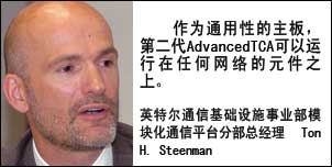 “目前我們是業(yè)內(nèi)第一家推出第二代AdvancedTCA產(chǎn)品的廠家”,英特爾通信基礎(chǔ)設(shè)施事業(yè)部模塊化通信平臺分部(MCPD)總經(jīng)理Ton