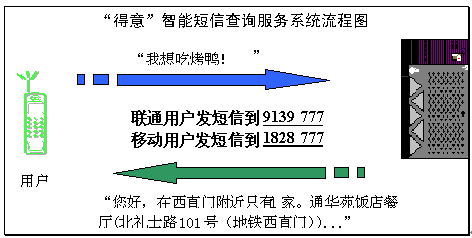2004年4月15日和4月20日,擁有完全自主知識產(chǎn)權(quán)的語音與語言技術(shù)開發(fā)商和技術(shù)提供商北京得意音通技術(shù)有限責(zé)任公司(得意公司),在國際上率先把中文自然語言理解技術(shù)應(yīng)用在中國聯(lián)通和中國移動短信服務(wù)平臺上,結(jié)合《精品購物指南》報社權(quán)威、全面的信息資源,開通了北京地區(qū)餐飲領(lǐng)域智能短信查詢服務(wù)(簡稱智能短信),并將進(jìn)一步支持互聯(lián)網(wǎng)平臺和WAP平臺,陸續(xù)開通更豐富和更實用的智能信息服務(wù)。