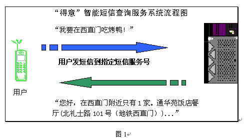 智能短信服務(wù),就是允許短信用戶在手機(jī)上直接以自然語言的形式輸入文字(而不是輸入復(fù)雜的代碼或操作繁瑣的菜單),系統(tǒng)能迅速、準(zhǔn)確地理解用戶的意思,提供周到的信息和服務(wù)。短信服務(wù)商可根據(jù)具體應(yīng)用領(lǐng)域定制一系列全新的智能短信業(yè)務(wù),如旅游交通、餐飲娛樂、金融證券、交友網(wǎng)聚、智力競猜等受歡迎的服務(wù),將直接刺激用戶使用短信服務(wù)的興趣和頻率。得意公司提供的北京餐飲智能短信服務(wù)可以靈活、方便地引導(dǎo)用戶找到合適的餐飲信息(圖1)