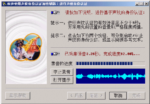 在彈出的窗口中輸入用戶名并點(diǎn)擊"語(yǔ)音身份認(rèn)證"按鈕,從彈出窗口中點(diǎn)擊"聲紋認(rèn)證"按鈕,根據(jù)系統(tǒng)提示,對(duì)著麥克風(fēng)說(shuō)出含有4秒以上有效語(yǔ)音的任意一段話,讓系統(tǒng)進(jìn)行聲紋身份認(rèn)證。如果被拒絕,系統(tǒng)會(huì)顯示一個(gè)對(duì)話框,提示用戶選擇是繼續(xù)嘗試,還是放棄;如果通過(guò),則系統(tǒng)會(huì)自動(dòng)打開用戶的私有加密文件目錄。