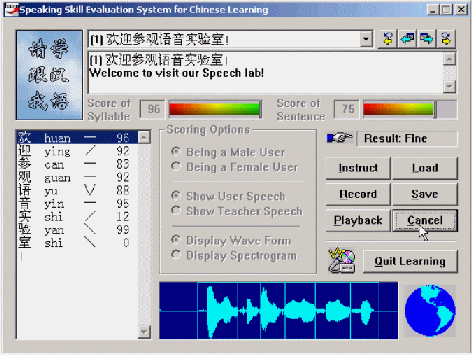 "得意"口語學(xué)習(xí)系統(tǒng)的原理是基于語音音素及其他參數(shù)的提取與分割,將使用者的語音音素系列與標(biāo)準(zhǔn)模型的語音音素序列進(jìn)行自動比對,并將比對結(jié)果通過視圖形象而直觀地給出,從而對學(xué)習(xí)者的語音給出恰當(dāng)?shù)脑u價(比如對每個音素給出一個得分等),以幫助其改進(jìn)和提高口語發(fā)音,使其接近或達(dá)到語音的標(biāo)準(zhǔn)水平。由于利用可視化的朗讀評分等人機(jī)交互的方式,而且通過視覺、聽覺等綜合手段,反復(fù)提示和幫助用戶接近標(biāo)準(zhǔn)發(fā)音,因而顯著提高了學(xué)習(xí)者的學(xué)習(xí)興趣,這對提高英語學(xué)習(xí)成績有很多幫助。