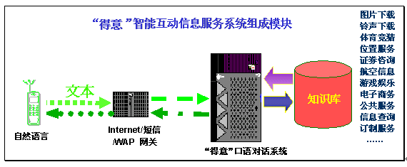 "得意"智能互動(dòng)信息服務(wù),是對(duì)用戶輸入的文本進(jìn)行自動(dòng)分析和理解,再?gòu)闹R(shí)庫(kù)中提取用戶所需的信息,然后自動(dòng)產(chǎn)生智能應(yīng)答語句,并以文本的形式通過電腦或者手機(jī)發(fā)回用戶。由于"得意"口語對(duì)話系統(tǒng)具有上下文相關(guān)理解和人機(jī)混合主導(dǎo)等強(qiáng)大功能,在指定的領(lǐng)域內(nèi),用戶可通過一次或者多次輸入(包括詞語、句子)構(gòu)成一組對(duì)話,完成復(fù)雜的信息查詢或者其他互動(dòng)信息服務(wù)。