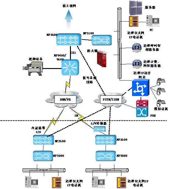 整個(gè)網(wǎng)絡(luò)采用了一臺(tái)MP3600企業(yè)級(jí)路由器和兩臺(tái)MP2600帶有語(yǔ)音模塊的路由器組建。核心路由設(shè)備由邁普MP3600模塊化路由器擔(dān)當(dāng),它直接連結(jié)上級(jí)網(wǎng)絡(luò),與MP9400/9600DDN節(jié)點(diǎn)機(jī)構(gòu)建的專網(wǎng)相連。在計(jì)費(fèi)和呼叫管理中心采用了10M/100M的MP5100簡(jiǎn)單網(wǎng)管型交換機(jī)作為網(wǎng)絡(luò)接入設(shè)備與核心路由設(shè)備連接,同時(shí)采用了防火墻隔離設(shè)備,以增強(qiáng)網(wǎng)絡(luò)安全系數(shù)。