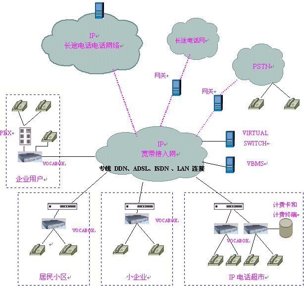 ISP及寬帶網(wǎng)絡(luò)運(yùn)營(yíng)商的本地電話接入網(wǎng)絡(luò),采用單級(jí)單域結(jié)構(gòu),在網(wǎng)內(nèi)安裝VIRTUALSWITCH虛擬交換系統(tǒng),它作為整個(gè)本地電話接入網(wǎng)絡(luò)的網(wǎng)守,以集中方式管理域內(nèi)的所有網(wǎng)關(guān)(VOCA-BOX),執(zhí)行地址翻譯,呼叫控制,帶寬管理,域管理等功能以及呼叫建立、拆除控制和呼叫管理等功能。在網(wǎng)內(nèi)安裝后臺(tái)計(jì)費(fèi)、認(rèn)證系統(tǒng)(VBMS),對(duì)各個(gè)語(yǔ)音終端實(shí)現(xiàn)計(jì)費(fèi)認(rèn)證及結(jié)算,同時(shí)完成號(hào)碼分配及網(wǎng)絡(luò)管理的功能。