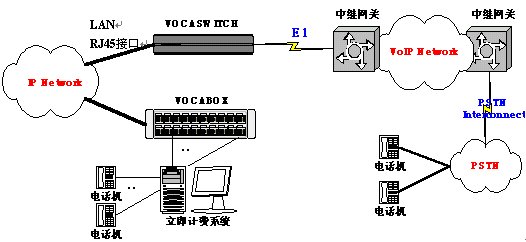 該方案中,使用一臺32口的VOCABOX作為32部普通電話的接入設(shè)備,VOCABOX的32個FXS接到立即計費系統(tǒng)上的計費卡上,電話機再接到計費卡上,本地IP電話中繼網(wǎng)關(guān)(VOCASWITCH)和運營商的IP電話中繼網(wǎng)關(guān)通過交換系統(tǒng)的E1中繼相聯(lián)。此連接方案無需本地IP電話設(shè)備直接接入網(wǎng)通、電信等運營商的IP電話網(wǎng),極大的保護了現(xiàn)有網(wǎng)絡(luò)的安全與完整。