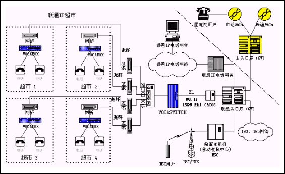 用戶端使用帶4~8個模擬端口的VOCABOX實現(xiàn)語音接入IP數(shù)據(jù)網(wǎng)。在局端采用的是聯(lián)通交換局中大量部署的華為C&C08 交換機的E1數(shù)字中繼接口資源與VOCASWITCH對接,并利用光端機加網(wǎng)橋連接聯(lián)通已有的光纖,實現(xiàn)聯(lián)通IP超市接入聯(lián)通電話網(wǎng)絡(luò)。