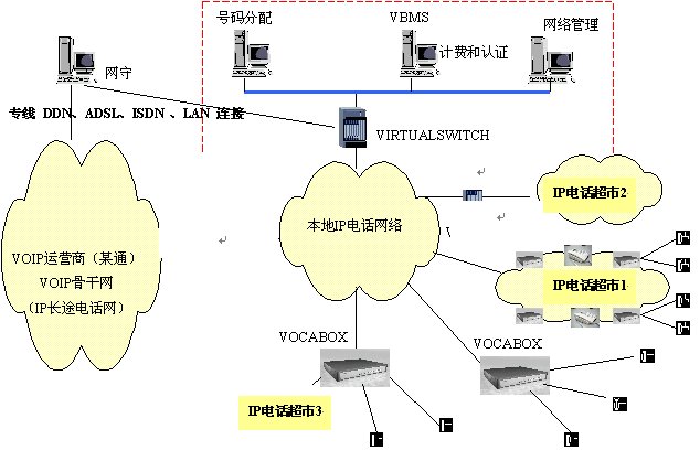 本方案中,各個超市的電話網(wǎng)絡(luò)通過IP方式接入到本地電話接入網(wǎng)絡(luò)。安裝VIRTUALSWITCH網(wǎng)關(guān)代理系統(tǒng),它作為整個本地電話接入網(wǎng)絡(luò)的網(wǎng)守(GATEKEEPER),以集中方式管理域內(nèi)的所有網(wǎng)關(guān)(VOCA-BOX)。